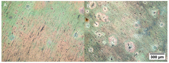 Optical Microscope images of the samples immersed for 120 h in Arabian Gulf seawater: (A) H-0.4Mg alloy and (B) L-1.4Mg alloy.