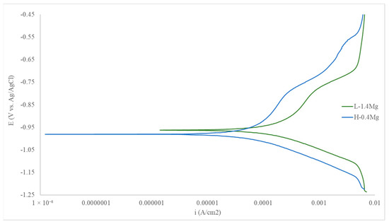 The samples were immersed in seawater for 120 h to investigate the corrosion activity on the particles, as shown in Figure 9. The impact of corrosion is dependent on the utilized composition, leading to varying reactions to the corrosion. Based on the image, it appears that corrosion may have begun in the area surrounding the particles, where the mismatch between the Al-matrix and the particles might have a chance. This result is supported by the cycle polarization test, as shown in Figure 10, which shows that the H-0.4Mg has the higher corrosion potential, while the L-1.4Mg has the lower corrosion potential. However, the particle size might be involved in the corrosion rate, where the L1.4Mg alloy has the bigger particle size, which enhances the corrosion rate compared to the small particle size in the H-0.4Mg alloy.