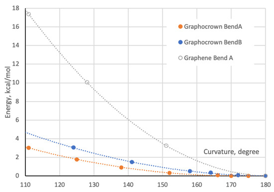 As the next step, we cut two different stripes from the single-layer graphocrown (in perpendicular directions), terminated them with hydrogens, and tried to bend them (Figure 2b,c). The relaxed scan in respect to the bending/torsional angle was performed in ORCA 5.0.4 with the r2SCAN-3c approach, which we consider as more reliable than the PM3 Hamiltonian intensively used in some work [69]. For consistency, we also cut graphene stripes of same shape. Figure 3 demonstrates the fact that graphocrown stripes can be bent (actually much more easily than graphene stripes), but still have minimal energy, being planar. In fact, due to hydrogen repulsion on the armchair edge, the graphene flakes actually have a destabilizing distortion. This also brings us to the controversy of the approach suggested in work [69]—while we agree that the improper usage of PBC might artificially stabilize nonoptimal conformations, the edge effects of an improperly terminated cluster approach might artificially destabilise planar structures, and the principal role here (for the single layers) is the lability or robustness of the “inner part” of the flake.