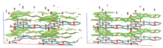 The reason for the unfavourable nature of the “pore-to-pore” stacking is the repulsive interaction of the oxygen lone pairs which face each other as the structure remains planar. This can be nicely demonstrated by non-covalent interaction (NCI) plots (Figure 4). While the “displaced” stacking on the interlayer distance of 6.5Å shows just the “unshaped” vdW interactions, the “pore-to-pore” demonstrates the very “well-defined” interaction regions, in particular for the interaction between the oxygens.