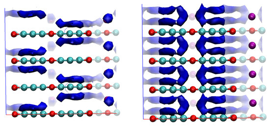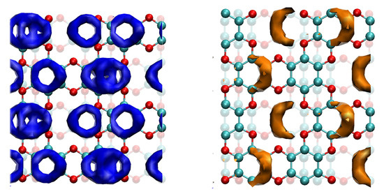 The Bader charge [53] analysis shows that in this system potassium atoms lose over 90% of their valence electron to the oxocarbon layers (similar to KC8). While Bader charges (as well as many other charges) are often controversial, we also performed a cluster simulation with a sandwich of a potassium atom between two “single rings” (shown in Figure 2a). We would like to mention the fact that ionisation calculated in this way should likely be overestimated, in comparison to the PBC bulk. For this system on PBE/def2-TZVP we obtained a Mulliken charge on K—+0.71, and a Löwdin charge of +0.18. (See charge distribution in Supplementary Materials). Such a difference should not be confusing, as pure agreement between different charge models is well known [73]. One can also try to make some evaluation relative to other materials, i.e., comparing the results with LiF (controversial, yet sometimes used as example, as Li is definitely a worse electron donor than K, and there are also stronger acceptors than F). From such a comparison, one can see that the K in the K-graphocrown is 10 to 20% (Bader and Mulliken, respectively), less ionic than the Li in LiF. As thousands of different references can be suggested here, and as the results still remain speculative and controversial, no further comparisons were performed here.