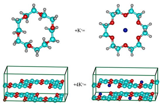 While the binding energy of the potassium cation in 18-Crown-6 was found to be about 2.5 eV (dipole correction has to be applied, and the check-up calculations with nonperiodic software (ORCA [45,46], PBE/def2-TZVP) resulted in 2.41 eV), the binding in graphocrown is much stronger (about 4.65 eV per potassium cation in the “pore-to-ring” geometry with monopole correction), see Figure 8. These results are in a good agreement with the stronger binding 1.4 eV in the 18-crown-6 incorporated into the graphene, in comparison to the binding into the “normal” 18-Crown-6 [33].
