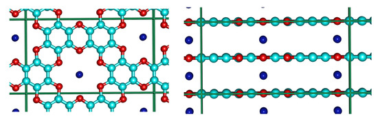 The design of promising materials is key to the development of applied science and technology [1]. One such material is graphene, whose theoretical research was initiated by P.R. Wallace in 1947, long before any real samples of the material were available [2]. The unique properties of graphene, predicted and then derived from experiments such as unusual thermal conductivity [3], high electron mobility [4,5], and optical transparency [6] gave a big jump-start to the development of electronics [7]. The graphene family can now be implemented in a wide range of applications in photovoltaics [8] and photodetection [9], painting [10] and sensing [11], drug delivery [12] and medicine [13]. However, unmodified graphene is a semi-metal with a zero gap, and has an extremely low on/off current ratio, which prevents it from being used in semiconductor devices such as field-effect transistors and logic circuits [14]. One of the approaches for tuning the electronic properties would be the introducing of heteroatoms—the formation of heterographenes [15]. For the first period (where the atoms match well the size of carbon and each other), there are several observed or predicted regular 2D materials—g-C3N4, [16] CB [17] and h-BN [18]. At the same time, carbon oxygenates are of much less interest, except for graphene oxide [19]—a mysterious irregular material with a not-fully understood structure. However, strong oxidising agents lead to the destruction of the p-p conjugation of the sp2 carbon network, and to a loss of conductivity in graphene oxides [20]. In addition, the inevitable heterogeneities and defects arising from the chemical modification of graphene can lead to the inevitable loss of the expected properties of the final materials [21]. The irregular distribution of functional groups and coordination centres can also have a negative impact on the properties of graphene oxide/metal composites [22].