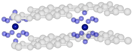 We found out that in the neutral cell of C48O24K4, potassium occupies the space between the centers of the pores in the “pore-to-pore” configuration (Figure 9).