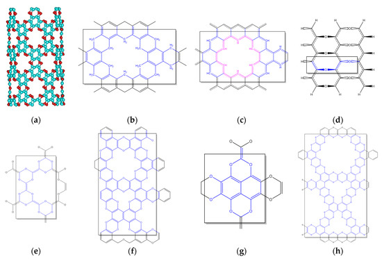 Inspired by graphether, as well as the coordination properties of crown ethers [30,31], in particular integrated into the graphene flaxes [32,33], we decided to combine these concepts and developed a covalent organic framework (COF) that would consist of graphene-planar crown ethers—the graphocrown. One of the key features of the new material is its preorganisation and fixed pore size. This is particularly important in the fields of selective membrane engineering [34], extraction [35], and catalysis [36]. Graphocrown could theoretically be used more successfully in environmental and medical problems, replacing its pure graphene analogues [37].