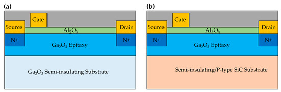 - Russell, S.A.O.; Perez-Tomas, A.; McConville, C.F.; Fisher, C.A.; Hamilton, D.P.; Mawby, P.A.; Jennings, M.R. Heteroepitaxial Beta-Ga2O3 on 4H-SiC for an FET With Reduced Self Heating. IEEE J. Electron Devices Soc. 2017, 5, 256–261. [Google Scholar] [CrossRef]