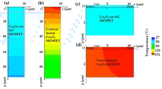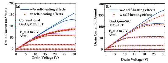 - Jia, X.; Hu, H.; Han, G.; Liu, Y.; Hao, Y. Analytical Model for the Channel Maximum Temperature in Ga2O3 MOSFETs. Nanoscale Res. Lett. 2021, 16, 29. [Google Scholar] [CrossRef]