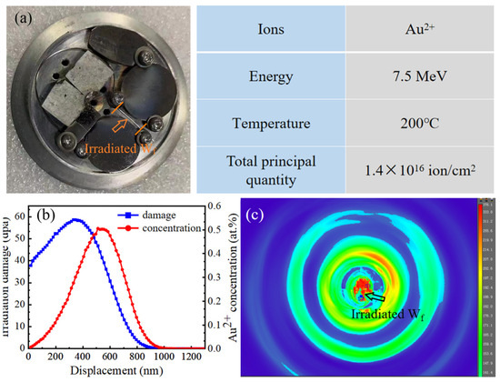 Tungsten fiber with a diameter of 300 μm (Zigong Cemented Carbide Co., Ltd., Zigong, China) was used as the subject of investigation. Heavy ion irradiation is normally used to simulate neutron irradiation for generating displacement damage on materials considering the cost and safety issues. The irradiation experiment was conducted with an HVE-3MV Tandetron Accelerator located at Sichuan University, Key Laboratory of Radiation Physics and Technology, Ministry of Education, China. The tungsten fiber was fixed in the sample holder together with other samples to be irradiated, and the position of the tungsten fiber and the major parameters for the irradiation experiment are shown in Figure 1a. A 7.5 MeV Au2+ ion was utilized as the irradiation source. The samples were heated until their surfaces reached a temperature of 473 K. The heating was stopped at the beginning of the irradiation process, and the samples’ surface temperatures were maintained at 376 K. The irradiation parameters are shown in the table of Figure 1, and the total accumulated fluences was 1.4 × 1016 ions cm−2. The depth distribution profile of the irradiation damage was calculated using the binary collision code, Transport of Ions in Matter (TRIM, add company name, add city, add country), in the SRIM-2008 software in which the “ion distribution and quick calculation of damage” mode was chosen. The lattice binding energy (Eb) and displacement threshold energy (Ed) were set to 0 and 90 eV, respectively. The peak damage level was 60 dpa, which was calculated via Equation (1):