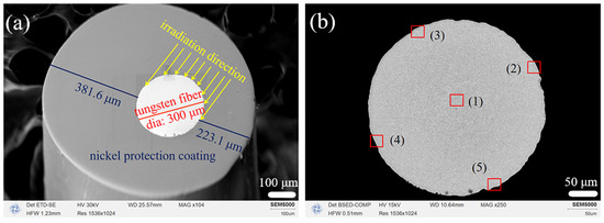 (a) Tungsten fiber with a protective nickel coating before the polishing process; (b) tungsten fiber after the polishing process, (1) Core of the fiber, (2) and (3) are irradiated area, (4) and (5) are un-irradiated area.