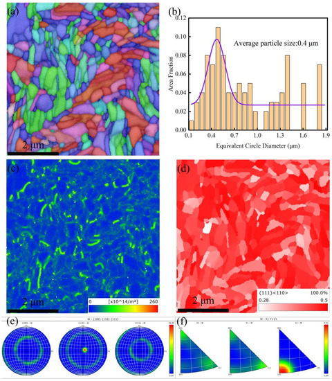 Figure 3a shows the grain morphology of region 1. This area was taken from a core of the tungsten fiber and had a good processing status. We chose this location as the reference to represent the initial state of the grain structure of the cross-section of the tungsten fiber. It can be seen that most of the grains exhibited irregular elongated shapes, and a small number of grains were an ellipsoidal shape that interlaced with each other. The distribution of the grain diameters is shown in Figure 3b, and according to the equivalent circle diameter and area weighted fraction, the average diameter of the grains is calculated to be 0.4 μm. It is known that tungsten fiber is produced via multiple drawing steps, and this causes the grains to have a high deformation rate. The high grain deformation rate contributes to the fine grain size at the cross-section and interlacing [30]. Figure 3c shows the corresponding average geometrically necessary dislocation density (GND) of region 1. Because of the high deformation rate during the fiber production process, the average GND of the tungsten fiber core was as high as 28.03 × 1014/m2, which indicates that the fiber has great plastic deformation capability in the Z-direction. Figure 3d shows the Schmidt factor values of each grain along the {111} packing direction <110>. The plastic deformation of materials is mainly achieved through slip, and the higher the Schmidt factor, the greater the probability of slip system initiation. It can be seen that the Schmidt factor values of all of the grains were between 0.28 and 0.5, which indicates that the grains were in the soft orientation state and prone to slip. Figure 3e,f display the polar and inverse pole figures of the investigated area, respectively. It can be observed that the tungsten fiber had a very strong texture {110} due to the axial grain slip during the production (drawing) process.