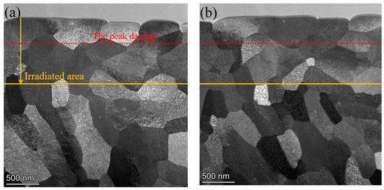 The morphology of regions 2 and 3 are shown in Figure 4. The areas from the top edge down to 1000 nm in depth are irradiation influenced areas, while the areas at the bottom are the unirradiated areas. It can be seen that it is difficult to detect any difference in the grain structure between the irradiated and unirradiated regions. However, this does not necessarily mean that no irradiation defect was produced by the irradiation process. Therefore, a further investigation was performed to explore the impact of irradiation on the grain orientation, such as the texture of the structure of the tungsten fiber. It is known that this tungsten fiber has a texture in the grain structure, since it was produced via large deformation. High-energy ion irradiation often leads to lattice changes, and different crystal planes have different resistances to ion irradiation. For instance, a previous study showed that the (110) crystal plane of single-crystal tungsten had the best radiation hardening resistance [31]. The irradiation influence could be detected via the change in the grain orientation.
