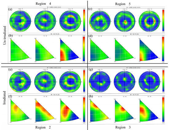 In Figure 5, the polar and inverse pole figures of the unirradiated (regions 4 and 5) and irradiated (regions 2 and 3) regions are presented. Figure 5a,b display the information for region 4; Figure 5c,d provide the information for region 5; Figure 5e,f present the information for region 2; and Figure 5g,h show the information for region 3.