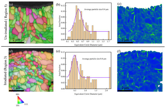 Further comparisons of the grain structure and GND between the irradiated and un-irradiated regions are shown in Figure 6. Figure 6a shows the grain orientation in the un-irradiated area, with most of the grains appearing green at the edges, which means most grains exhibited {110} planes. As a comparison, the grain orientation in the irradiated area is shown in Figure 6d, and more red grains can be found at the edge. This indicates that the tungsten fiber underwent significant lattice distortion during irradiation, e.g., the texture with {100} planes was replaced with {110} planes. Meanwhile, it can be seen that the average diameter of the grains calculated according to the equivalent circle diameter and area weighted fraction were both 0.4 μm for the irradiated and unirradiated cases (Figure 6b,e). The average values of GND were 23.7 × 1014/m2 and 23.2 × 1014/m2 for the irradiated and unirradiated areas, respectively. The tungsten fiber still had a certain plastic deformation ability along the z-axis direction after irradiation.