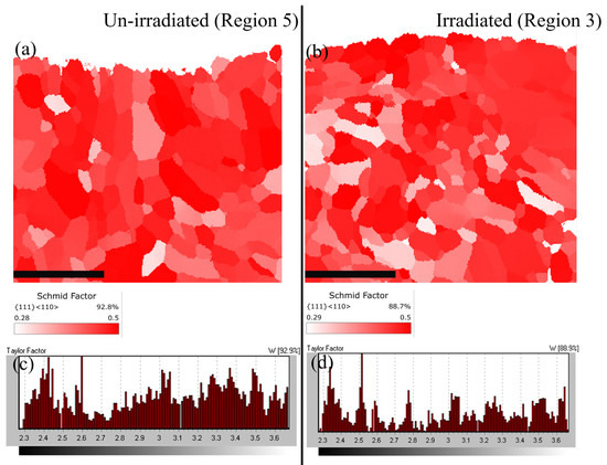 The Schmidt factor and Taylor factor before and after irradiation: (a,b) unirradiated region; (c,d) irradiated region.