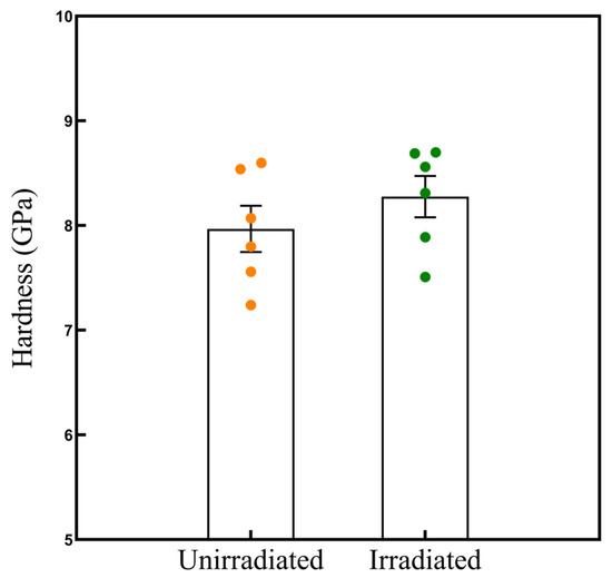 Finally, we characterized the hardness of the irradiated and unirradiated areas using the nanoindentation test. Because of the curvature structure of the tungsten fiber’s surface, the nanoindentation test was performed in the following way: an indenter head with a diameter of 2 μm was selected for the indentation; the indentation depth was set at 400 nm, corresponding to the depth of the maximum displacement damage location. Figure 8 shows the hardness results. The average hardness of the irradiated case was 8.37 GPa, which was 0.33 GPa higher than that of the unirradiated. The degree of irradiation hardening is related to the value of displacement per atom (dpa) and the irradiation temperature. A larger dpa and higher irradiation temperature lead to greater irradiation hardening. Table 1 shows the irradiation hardening of tungsten materials prepared using different processing techniques over recent years.