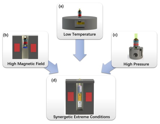 Practically, it is difficult to load two or more extreme conditions at the same time in an extreme-condition Raman setup. In most traditional extreme-condition Raman setups, the cryostat, superconducting magnet, or diamond routine anvil cell (DAC) are normally placed under the microscope of a commercial micro-Raman spectrometer, as illustrated in Figure 10a–c. Due to the specific geometries of these instruments providing extreme conditions, it is difficult to combine all of them together under a regular microscope. Moreover, since Raman spectra have to be collected outside the sample chamber, the numerical aperture (NA) of the microscope lens is low, resulting in low spatial resolution and a low signal-to-noise ratio in the Raman spectra.