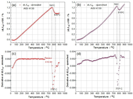 Dilatometric curves and first derivatives for (a,c) annealed and (b,d) quenched samples of AISI 4130 (v = 5 °C.min−1).