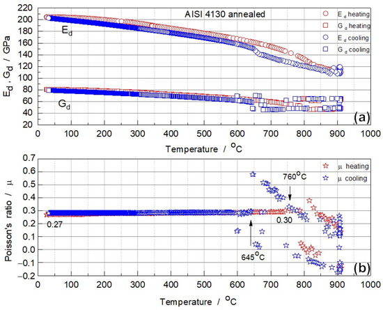 (a) Moduli Ed, Gd and (b) Poisson’s ratio μ of annealed AISI 4130 specimen during heating and cooling.