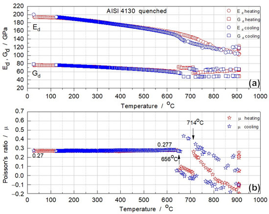 (a) Moduli Ed, Gd and (b) Poisson’s ratio μ of quenched AISI 4130 specimen during heating and cooling.