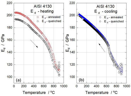Ed of annealed and quenched samples of AISI 4130 during (a) heating and (b) cooling cycles, the arrows indicate the course of the temperature change.