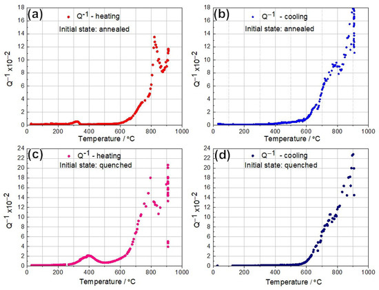 Values of internal friction (Q−1) of AISI 4130 in (a,b) annealed and (c,d) quenched state, during (a,c) heating and (b,d) cooling.
