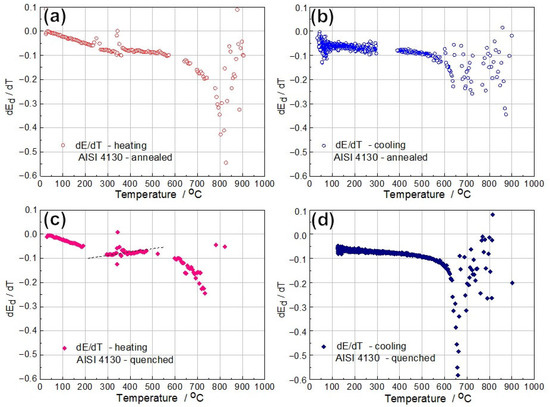 First-order temperature derivative (dEd/dT) curves of AISI 4130 in the initial (a,b) annealed and (c,d) quenched states during (a,c) heating and (b,d) cooling.
