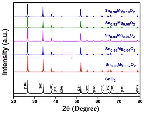 Figure 1 displays the XRD patterns of the synthesized compounds, i.e., Sn1−xMgxO2 (with x = 0, 0.02, 0.04, 0.06, 0.08, and 0.10), measured at room temperature (30 °C). According to the information on JCPDS Card No. 14-1445, both undoped SnO2 and Mg-doped SnO2 compounds exhibit a well-tetragonal rutile-type structure associated with the P42/mnm space group of SnO2. Within the range of the XRD, there was no detection of any additional diffraction peaks, which indicates that the samples are formed in a single phase, and no secondary phase is present, i.e., it does not include any crystalline parasitic phases. Moreover, it indicates that the samples are solvable up to a 10% Mg doping concentration.