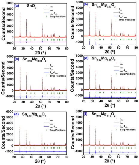 The XRD patterns of the Sn1−xMgxO2 compounds (with x = 0, 0.02, 0.04, 0.06, 0.08, and 0.10), as refined via the Rietveld refinement method [] using the Fullprof programming software-2021 [], are displayed in Figure 2. Scale factors, background parameters, instrumental zero-point, lattice parameters (a, b, and c), peak shape parameters, individual anisotropic thermal and occupancy of atoms, and many more aspects were taken into account and refined in a systematic step-by-step approach during the Rietveld refinement method (using Fullprof software-2021), ensuring that the output accurately reflected a reliable value. In this illustration, the experimental data are depicted as circles, while the computed intensities are depicted as solid lines. The lines at the bottom of the graph show the difference between the observed and estimated intensities. This diagram denotes the permitted Braggs positions for the P42/mnm space group as short vertical lines. It can be observed that the Rietveld software’s computed XRD data and the experimental XRD data line up exactly with one another.