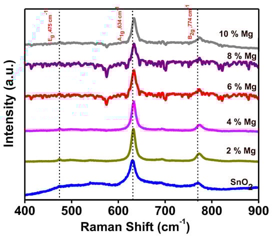 Here, the Raman active modes are A1g, B1g, B2g, and Eg, whereas the infrared active modes are A2u and Eu, and the inactive modes are A2g and B1u. The simultaneous stretching of each Sn–O bond along a direction that maintains the crystal’s symmetry is a typical aspect of the A1g mode. The B2g mode, on the other hand, includes asymmetric stretching of the Sn–O bond, i.e., stretching along a path that destroys the crystal’s symmetry. Figure 5 displays the room temperature (30 °C) Raman spectra of Mg-doped SnO2 compounds, with observations made in the 400 to 900 cm−1 spectral range. The two detectable Raman active modes of pure SnO2 bulk materials at around 631 cm−1 can be assigned to the A1g mode, and 769 cm−1 can be assigned to the B2g mode. These measured Raman modes of A1g (symmetric Sn–O stretching) and B2g (asymmetric Sn–O stretching) can be indexed to the tetragonal phase of SnO2 [,,]. Table 2 provides the A1g and B2g mode’s Raman peaks and intensities. As illustrated in Figure 6, the Lorentzian function fitting for these Raman active mode peaks (A1g, B2g) revealed that the resonance peaks of A1g and B2g are shifted towards the larger wave number (i.e., blue-shift) by increasing Mg doping concentrations. Here, the black lines represent the combined fitting for both peaks, whereas the green lines indicate the individual peak fitting. Moreover, it was noticed that the magnitude of A1g and B2g peaks’ intensity changes in an irregular way by increasing the doping concentration of Mg in SnO2. The change in the intensity might be related to the crystallite size of the synthesized materials, as observed in other studies. A study by J. Zuo et al. [] reported that intensity peaks have a dependency on the crystallite size. Additionally, it was noticed that no apparent peak corresponding to the Eg mode of vibration, usually located at 475 cm−1 is observed. Thus, the development of the tetragonal rutile phase of SnO2 was confirmed by both Raman spectra and XRD patterns.