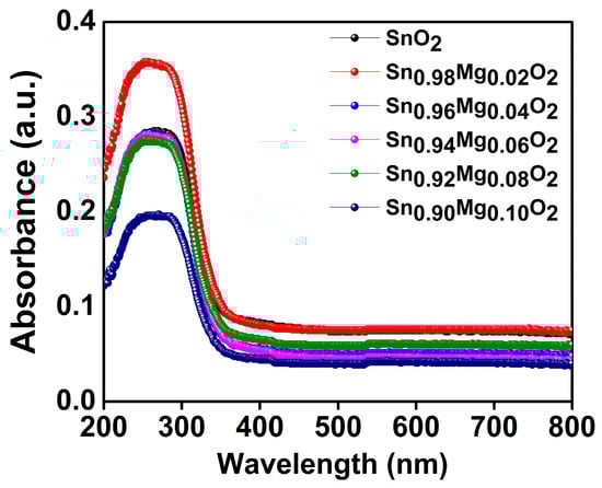 The optical absorption spectra of the Sn1−xMgxO2 compounds with varying compositions (x = 0, 0.02, 0.04, 0.06, 0.08, and 0.10) were measured using a UV-Vis spectrophotometer. Figure 7 shows the measurement of absorbance spectra of Mg-doped SnO2 compounds with 0, 2, 4, 6, 8, and 10 at.% of Mg. The experiments were conducted in the wavelength range of 200–800 nm. All samples have a UV absorption edge at 250 nm in their absorption spectra. This may be due to optical transitions between the valence and conduction bands (O2p to Sn3d), which causes the tin oxide’s intrinsic band gap to absorb light []. However, spectral transmittance data between 360 and 800 nm clearly demonstrate transparency. The SnO2 UV absorption edge in these compounds is located at 250 nm, making them effective at blocking light with a wavelength of less than 360 nm. With increased Mg content, the transmittance value rises from 83% (for pure SnO2) to 91% (for Sn0.90Mg0.10O2). The enhancement in transmittance with increasing doping concentrations may result from optical scattering due to uniformly distributed particles []. The energy band gaps of the materials were determined by applying the following formula: