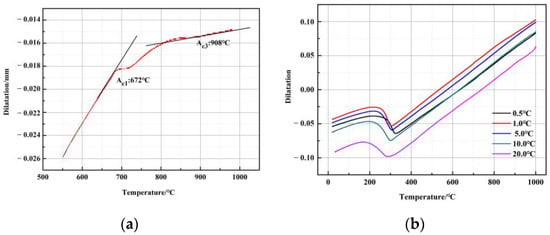 Dilatometric results of cold-rolled steel during the heat treatments (a) Ac1 and Ac3 temperature of cold-rolled steel measured during the heating process; (b) dilatometric results of the steel during the cooling process.