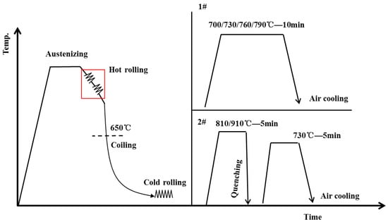 Schematic diagram of the rolling process and heat treatments for the medium-Mn steel.