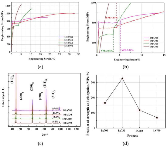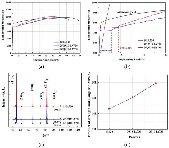 (a) Engineering stress-strain curves of the 2# annealing process, (b) YPE of the 2# annealing process, (c) austenite volume fraction of the 2# annealing process, and (d) PSE of the 2# annealing process.