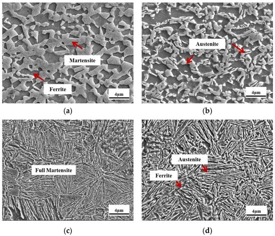 Figure 5a–d describes the SEM microstructure of the samples that underwent a 2# annealing process. In Figure 5a, the microstructure is mainly composed of ferrite, martensite, and a limited amount of austenite which was retained due to the small grain size and relatively high stability [32]. Figure 5b exhibits the microstructure of ferrite and austenite. In addition, it is evident that two types of austenite and ferrite morphology were formed, namely, lath-like and block-like. It can be inferred that the block-like austenite and ferrite grains resulted from the retained block-like austenite and ferrite grains in the 2#Q810 sample, and the lath-like austenite and ferrite grains contributed to the ART on the martensitic matrix of the 2#Q810 sample. A 910 °C quenching process was applied to obtain a full martensitic morphology, as shown in Figure 5c. Obviously, after 910 °C annealing, the steel was fully austenitized, in accordance with the Ac3 (908 °C) detected in Figure 2. Figure 5d shows the microstructural morphology of the 2#Q910-IA730 sample. A dual phase consisting of lath-like austenite and ferrite distributed, contributing to the ART on the full martensitic matrix of the 2#Q910 sample.