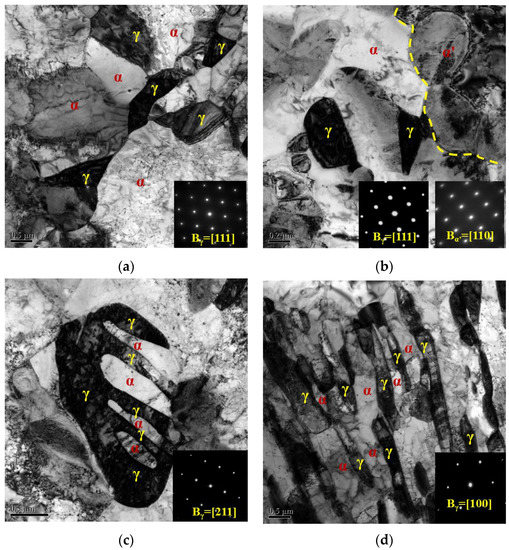 According to the observations in Figure 3 and Figure 5, it is apparent that different austenite morphologies were obtained after different annealing processes. TEM observation was used to analyze the austenite evolution in detail, as shown in Figure 7. Figure 7a describes the TEM morphology of the 1#IA730 sample and the corresponding diffraction spot. Obviously, the austenite in the 1#IA730 sample displayed a block-like morphology and was distributed on the recrystallized ferrite grain boundaries. As mentioned above, 1#IA730 was the optimal annealing process due to the relatively high austenite fraction and good strength-ductility combination. Under the low temperature in the 1#IA700 sample, not enough austenite formed; instead, cementite was distributed dispersedly. When samples 1#IA760 and 1#IA790 were exposed to a high temperature, the martensite fraction gradually increased due to the decreasing austenite thermal stability [33]. Thus, it was obvious that during the 1# annealing process, the degree of C and Mn enrichment was crucial to the austenite reversed transformation and that ferrite recrystallization proceeded effectively due to the sufficient strain stored energy. At lower annealing temperatures, it was difficult to dissolve cementite, hindering the proceeding of austenite reversed transformation. At higher temperatures, low average C and Mn content are distributed in a high amount of austenite, leading to low phase stability and martensitic transformation during cooling. Figure 7b shows the TEM morphology and associated diffraction spot of the 2#Q810 sample. Austenite grain was observed with a small grain size of about ~700 nm, while martensite grain appeared with a high grain size of about ~1000 nm. Figure 3 and Figure 5 show that 810 °C was a relatively high intercritical annealing temperature, resulting in a high austenite fraction and low stability during cooling. Accordingly, the majority of austenite grains in the intercritical region transformed to martensite after quenching, and only a small part of austenite with a small grain size was retained due to the relatively high stability [34]. Figure 7c presents the TEM morphology and the corresponding diffraction spot of the 2#Q810-IA730 sample. Clearly, two types of austenite are exhibited in the microstructure, namely, block-like and lath-like. The block-like austenite grains were the small ones retained in the 2#Q810 sample. The lath-like austenite was transformed from the martensite of the 2#Q810 sample, which proved the occurrence of the second austenite reversed transformation on the martensitic matrix. Figure 7d shows the TEM morphology and the corresponding diffraction spot of the 2#Q910-IA730 sample. Lath-like austenite and ferrite are distributed on the whole microstructure. This indicates that sufficient austenite reversed transformation occurred on the full martensitic matrix obtained in the 2#Q910 sample.