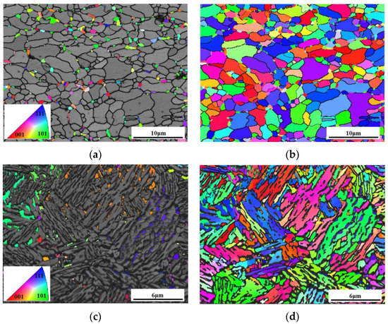 Figure 8 demonstrates the orientation maps of austenite and the microstructure of the sample under different processes, respectively. As shown in Figure 8a,b, it was obvious that the austenite grains exhibited random orientations. This indicates that cold-rolling deformation broke the martensitic structure of the hot-rolled sample. As a result, during the subsequent intercritical annealing, the austenite grains nucleated and grew randomly oriented from the martensite with C and Mn enrichment. In addition, ferrite recovery and recrystallization proceeded to release the strain energy [35]. Consequently, ferrite exhibited as block-like and austenite distributed on the ferrite grain boundaries as a block-like type (Figure 7a). In contrast, it can be seen in Figure 8c,d that the austenite grains in some packets have the same orientation. This demonstrates that austenite inherited the morphology of quenched martensite, and only nucleation and growth proceeded effectively. The recrystallization of the untransformed martensite was restricted by surrounding lath-like austenite, and the martensite recovered to ferrite by the reduction of dislocations accompanied by the partition of C to austenite so that ferrite exhibited lath-like morphology and crystallographic orientation of quenched martensite. In summary, deformed martensite provided sufficient stored strain energy, leading to a high degree of martensitic recovery and recrystallization, resulting in block-like morphology and random orientation. However, not enough stain energy could be obtained only by quenching, leading to the restriction of martensitic recovery and recrystallization, contributing to retaining the lath-like morphology and the same orientation.
