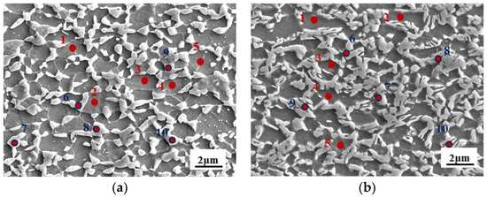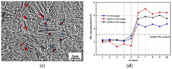 SEM morphology of the (a) 1#IA-730 sample, (b) 2#Q810-IA730 sample, and (c) 2#Q910-IA730, (d) Mn concentration of different annealed samples using SEM-EDS analysis according to the points marked in (a–c). 1 to 5 detected points were in ferrite, and 6 to 10 detected points were in austenite in the corresponding microstructure.