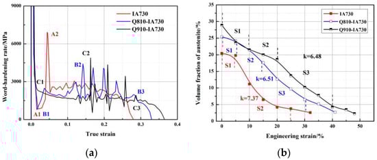 The work-hardening (WH) curves were introduced to estimate austenite mechanical stability, as shown in Figure 10a. A1, B1, and C1 are the first obvious inflection points of the 1#IA730, 2#Q810-IA730, and 2#Q910-IA730 samples in the WH curves, respectively. As D.K. Wilsdorf reported, the reduction of WH at an early stage was considered a dynamic recovery of dislocations of ferrite [22]. It was shown that three WH curves exhibited an apparent reducing trend at the early stage. On the other hand, whereas the corresponding WH rates of A1 and B1 were near 740 MPa, the corresponding WH rate of C1 was close to 2745 MPa. Clearly, C1 was much higher than A1 and B1. This result contributed to the different ferrite morphologies. In both 1#IA730 and 2#Q810-IA730 samples, a large amount of block-like ferrite grains formed during intercritical annealing. As mentioned above, the acquirement of block-like ferrite relied on sufficient recovery and recrystallization, leading to a low density of dislocations in ferrite. Thus, compared to the neighboring austenite grains, block-like ferrite exhibited lower strength and deformed preferentially during tensile deformation. However, ferrite exhibited a lath-like morphology in the 2#Q910-IA730 sample due to inactive recovery and recrystallization. Due to the retention of a relatively high density of dislocations, the lath-like ferrite had a relatively high strength comparable to the neighboring austenite grains. Thus, ferrite and austenite grains deformed together during the tensile deformation. Then, austenite underwent the TRIP effect to transform into martensite, leading to a slow dropping after C1. A2, B2, and C2 were the inflection points of sharp increase of 1#IA730, 2#Q810-IA730, and 2#Q910-IA730 samples in WH curves, respectively. As Cai reported, the sharp increase was associated with the active TRIP effect of austenite grain in medium Mn steel [24]. It was demonstrated that the corresponding strain of A2 was the lowest, and the corresponding strain of B2 was lower than C2. This contributed to the austenite stability. It was shown that the austenite grains exhibited low chemistry stability due to the low Mn enrichment and block-like morphology in the 1#IA730 sample. The cooperation led to the occurrence of an active TRIP effect. Interestingly, the austenite grains in the 2#Q810-IA730 sample exhibited higher chemistry stability than in the 2#910-IA730 sample; however, the corresponding strain of C2 was higher than B2. This was associated with the preferential TRIP effect of block-like austenite in the 2#Q810-IA730 sample. To prove the occurrence of TRIP at different strains, Figure 10b was introduced. In the 1#IA730 sample, the curve of the austenite fraction at different strains was divided into two stages (S1 and S2). During S1, a small dropping of austenite fraction appeared due to dynamic recovery, and during S2, a sharp dropping of austenite fraction appeared due to the active TRIP effect, which matched agreement with our previous discussion. In the 2#Q810-IA730 sample, the curve of austenite fraction at different strains was divided into three stages (S1, S2, and S3). The S1 in the 2#Q810-IA730 sample was similar to the 1#IA730 sample. S2 showed a sharp dropping trend associated with the TRIP effect of block-like austenite. S3 presents a relatively gradual decreasing trend due to the sustain TRIP effect of the rest lath-like austenite. Differently in the 2#Q910-IA730 sample, the curve of austenite fraction at different strains was divided into three stages (S1, S2, and S3). However, during S1, an obvious reduction of austenite content was observed. This result is consistent with the slow-dropping trend shown in Figure 10a; the TRIP effect proceeded at an early stage due to the similar strength of lath-like ferrite and austenite. Compared to the S2 in the 2#Q810-IA730 sample, the S2 in the 2#Q910-IA730 sample showed a slower dropping trend. This indicates that lath-like austenite exhibited higher stability than block-like austenite. Then, S3 in the 2#Q910-IA730 sample presented a similar dropping trend to the 2#Q810-IA730 sample.