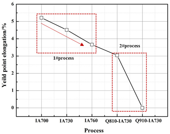 The yield point elongation of different annealed samples subjected to 1# and 2# process.