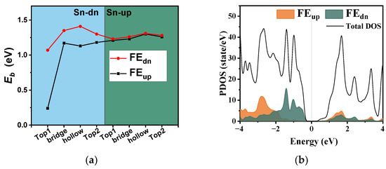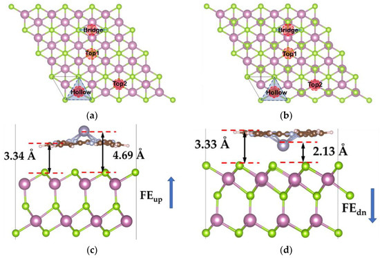 To investigate the most stable adsorption configuration of SnPz on the surface of In2Se3 in different polarization states, as depicted in Figure 2a,b, by considering the relative position of the central Sn atom of SnPz to In2Se3, we tested eight different adsorption configurations for each case. In these configurations, the raised up (Sn-up) or sunken downward Sn atom in SnPz was located above the top layer In atom (Top1 site), above the top layer Se atom (Top2 site), above the bridge position between two adjacent top layer In atoms (Bridge site), or above the center of the triangle region in the lower right corner of the In2Se3 unit cell (Hollow site), respectively. The calculation results are shown in Figure 2c,d and Figure 3a, where the most stable adsorption configuration of SnPz in both FEup and FEdn states was with the Sn atom located above the Hollow site, corresponding to a large adsorption energy of 1.30 eV and 1.41 eV, respectively, indicating that these two adsorption structures are very stable at room temperature. Interestingly, there were significant differences in the relative positions of the Sn atom in the two polarization directions. When the system was in the FEup state, the central Sn atom was in the Sn-up configuration, and the distance between the porphyrazine molecule and In2Se3 was 3.34 Å. When in the FEdn state, the Sn atom configuration was Sn-dn, meaning that the Sn atom was located at the interface between the porphyrazine molecule and In2Se3. At this time, although the porphyrazine molecule was still far from the substrate (3.33 Å), the distance between the Sn atom and In2Se3 was only 2.13 Å, which means that the Sn atom may serve as a medium to enhance the interaction between SnPz and In2Se3. In summary, in the most stable structure of SnPz/In2Se3, the relative position of the Sn atom exhibited a significant ferroelectric dependence.