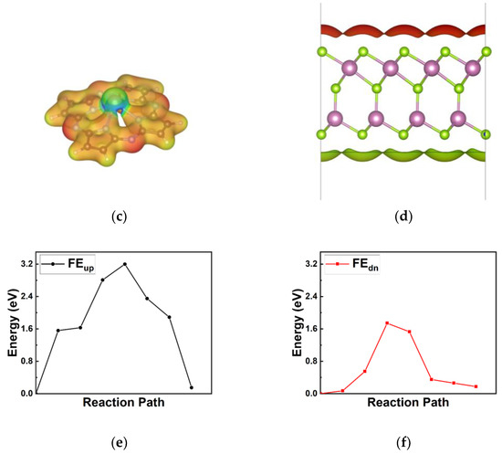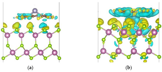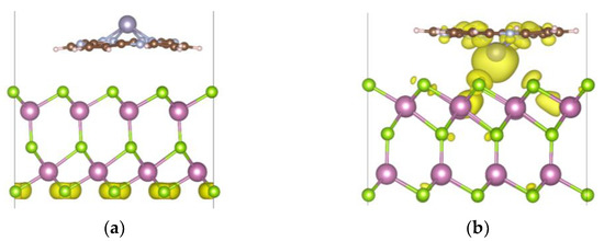 The difference in occupation states near the Fermi level induced by ferroelectricity has an impact on the space charge distribution. As depicted in Figure 5a,b, the charge density was calculated in the range of −0.5 to 0 eV, and the results are presented under the same charge density isosurface. When the system was in the FEup state, there was almost no charge distribution in the structure, especially at the interface. However, when the system was in the FEdn state, the charge localization on the In2Se3 surface and SnPz molecule was clearly observable. The significant difference in charge distribution induced by ferroelectricity near the Fermi level makes it more suitable for interesting applications.