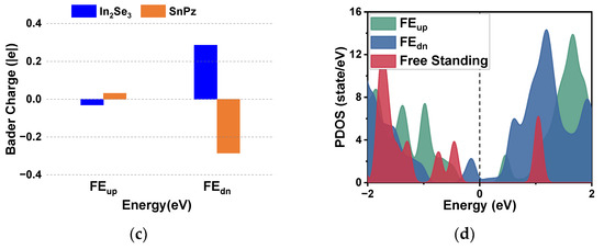 To comprehend the electronic properties of the two adsorption structures under different polarization directions, an analysis of their electronic structures was conducted. As illustrated in Figure 4a,b, the differential charge analysis revealed that in the FEup state, the distance between the SnPz molecule and In2Se3 was large, resulting in a weak charge exchange between the porphyrazine and In2Se3. Conversely, in the FEdn state, the Sn atom concaved downwards, significantly reducing the distance between SnPz and In2Sn3 (from 3.34 Å in the FEup state to 2.13 Å), thereby facilitating the transfer of charges between them. As shown in Figure 4b, a charge transfer channel was formed between the Sn atom and In2Sn3. Both Sn and porphyrazine were evidently in a state of electron loss, and transferred electrons to three nearby Se atoms through the Sn atom. This was further corroborated through Bader charge analysis, as presented in Figure 4c. When the system was in the FEup state, In2Se3 transferred 0.03 electrons to SnPz through the porphyrazine molecule. Conversely, in the FEdn state, due to the significant electronegativity difference between Se and Sn atom (Se: 2.55, Sn: 1.96), SnPz lost 0.26 electrons to In2Se3 through the Sn atom. Correspondingly, in the PDOS diagram in Figure 4d, compared to the free state, a significant relative displacement of the density of states of adsorbed SnPz near the Fermi level occurred in the occupied state. In the FEup state, the occupied state near the Fermi level moved downwards due to electron gain. Conversely, in the FEdn state, the occupied state moved upward due to electron loss, and even produced a significant electron state occupancy at the Fermi level. In summary, by adjusting the geometric structure and charge transfer, the ferroelectric polarization can result in significantly different electronic structure of SnPz/In2Se3 near the Fermi level in different polarization states.