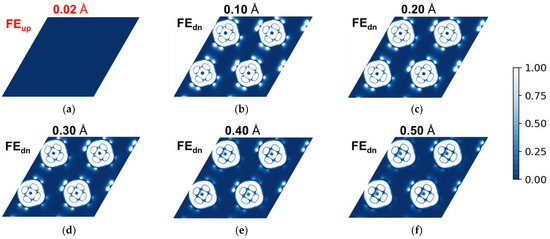 This charge redistribution induced by ferroelectricity reminds us that one can obtain the polarization state of the substrate directly by measuring the states of the molecule. Additionally, the states of the molecule can be measured by the tunneling current as is realized in a scanning tunneling microscope (STM). Because below the Fermi level as far as 0.5 eV, the FEdn polarization generates a state on the macro-ring while the FEup does not, which indicates that in bias voltage of −0.5 V, the FEdn can generate tunneling current while the FEup cannot. To be more specific, the STM images of structures under different polarization states were simulated, and the tunneling currents were detected at distances of 0.1 Å, 0.2 Å, 0.3 Å, 0.4 Å, and 0.5 Å on the surface of the material at a constant height mode with a bias voltage of −0.5 V. The results are displayed in Figure 6. The brightness areas suggest that significant tunneling currents were detected in the range of 0.1–0.5 Å on the surface of SnPz/In2Se3 in the FEdn state, while no tunneling current was observed at all in the FEup state. This characteristic makes the SnPz/In2Se3 system highly promising for ferroelectric memories. In SnPz/In2Se3, the presence of a tunneling current at a bias voltage of −0.5 V could be detected to obtain the stored information in the structure, thereby avoiding the repeated application of external voltage to the structure during information readout, which greatly extends the life of the memory by reduce ferroelectric fatigue.