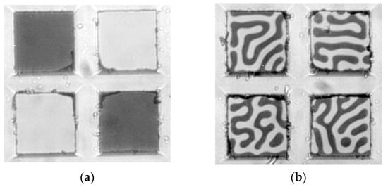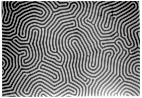 Films are transparent; consequently, the structure of magnetic domains can be observed in any common polarizing microscope by using the Faraday effect. It means that a lot of information about the correlation between domain structure and magnetization process can be obtained by simultaneous measurement of the samples’ magnetization and domain structure visual observation. A typical stripe domain structure can be seen in Figure 2.