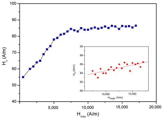 The dependence of the Hc coercivity is determined as the half-width of the series of minor hysteresis loops with increasing Hmax field values. Insert: magnified part of the curve in the 7500–17,500 A/m Hmax field region.