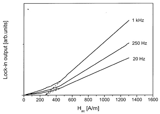 This method is performed on an optical bench, and the Faraday effect is used to detect the changes in the magnetic state [63]. Measurement starts from the demagnetized, equilibrium domain structure, which is reached by an ac field demagnetization. The ac measuring field is oriented normally to the sample plane, and its amplitude is increased linearly from zero. The amplitude of the domain wall response is measured by using a lock-in amplifier. From the recorded curves, the average displacement of the domain walls can be determined as a function of the increasing ac magnetic field amplitude. The linear part of the detected plot is extrapolated to the zero domain-wall response. The corresponding field amplitude is denoted as Hcw. The accuracy of the measurement is about ±10 A/m. The detected curves, together with the way of extrapolation, are shown in Figure 5. This graph is presented for illustration of the measurement, and because of this, a garnet sample with unusually large coercivity was chosen. In this graph, it is indicated as well that the measurements were performed at different frequencies of the measuring field (20 Hz–1 kHz). The domain wall coercive field, determined from the graphs, is Hcw = 290 A/m.
