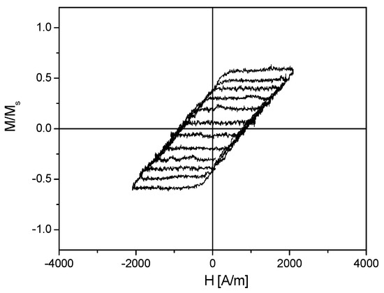 Quasistatic CL hysteresis loops are measured in a VSM (vibrating sample magnetometer. The accuracy of the measurement is ±150 A/m for determining the width of loops. The MS saturation magnetization is also measured by VSM measurements, detecting the saturation hysteresis loops along the easy axis. As an illustration, a set of measured minor loops (at f = 25 Hz frequency) is shown in Figure 6, with increasing Hmax values. Again, this graph is for the illustration of the measurement, and this measurement was performed on another sample than shown in Figure 5. Moreover, for better visibility of curves, a measurement is shown, which was performed at T = 71 K temperature after a computer elimination of the paramagnetic contribution of the substrate. It is seen that the coercive field is constant Hc = 920 A/m, regardless of the applied slope of magnetizing field.