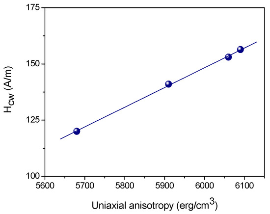 Measuring the Hcw and Ku values, which belong to the same thickness of the substrate, it was possible to find that a linear relationship between Hcw and Ku, as shown in Figure 8. This correlation is characteristic of the given material. The experiment showed—in agreement with the theoretical model—that the domain wall coercive field (measured by the wall oscillation method) highly depends on the uniaxial anisotropy. The slope of this linear function represents the intrinsic coercivity of the material. This result makes a good start for subsequent quantitative evaluations of the relevance of different theoretical models of domain wall coercivity to currently studied materials. However, this result does not mean that coercivity can be calculated by measuring the uniaxial anisotropy of the actual sample.