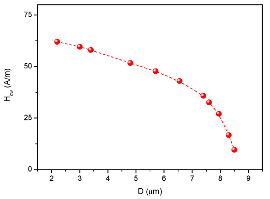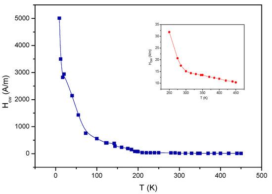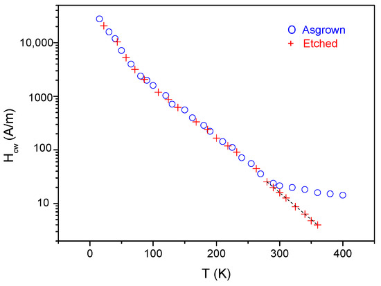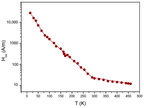The measured temperature dependence of the domain wall coercivity is shown in Figure 9. The domain wall pinning field changes as expected: the increasing domain wall energy density leads to an increase of Hcw, while the increasing domain wall width reduces the observed value of Hcw. Considering the importance of the Hcw(T) correlation, an independent subsection is devoted to this problem; it is not discussed here.