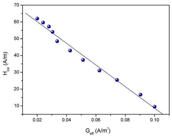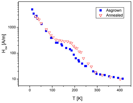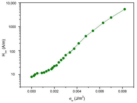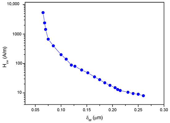 The quantitative correlation between Hcw and the domain wall parameters can also be calculated based on these figures. The dependence of the domain wall pinning on the domain wall parameters can be determined by comparing the measured Hcw(T) and calculated δw(T) and σw(T) curves. Hcw is shown in Figure 10 as a function of the domain wall energy density. In this graph, each point represents the corresponding values of Hcw and σw at a given temperature. In Figure 11, a similar relation between Hcw and δw is presented. Hcwe varies as expected: the increasing domain wall energy density leads to an increase of Hcw, while the increasing domain wall width significantly reduces the observed value of Hcw. From these figures, a quantitative correlation between Hcw and the domain wall parameters could also be calculated.